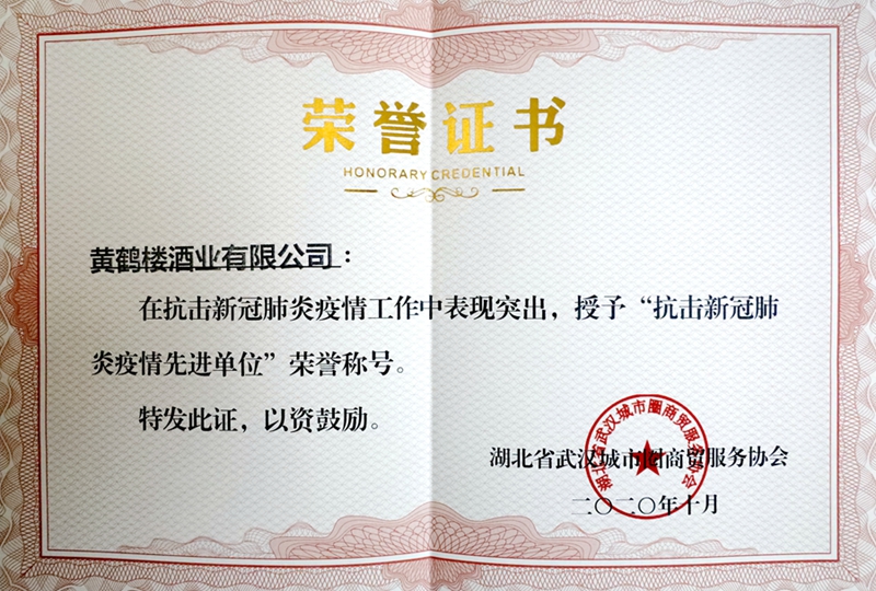 近日,湖北省武漢城市圈商貿服務協會為參與抗擊新冠肺炎疫情具有杰出貢獻的先進單位和個人進行頒獎,黃鶴樓酒業獲“抗擊新冠肺炎疫情先進單位”榮譽稱號。