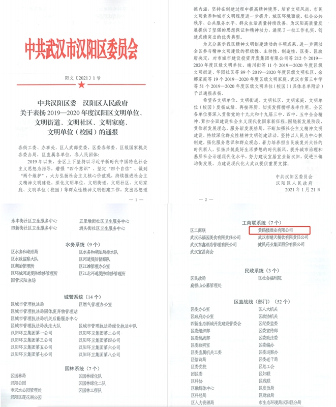 黃鶴樓酒業榮獲“2019-2020年度漢陽區文明單位”稱號