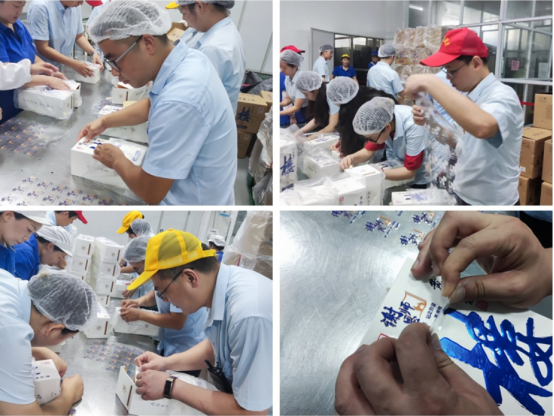 為確保樓20謝恩師定制產(chǎn)品順利生產(chǎn)上市,生產(chǎn)黨支部、財務(wù)審計黨支部響應(yīng)號召,充分發(fā)揮黨員先鋒模范作用,開展產(chǎn)品貼標(biāo)活動。時間緊、任務(wù)重,黨員們在車間工作人員指導(dǎo)下有序進行貼標(biāo),埋頭苦干、一絲不茍,與一線員工齊奮斗,本著不浪費一張標(biāo),不貼花一個盒子原則,保質(zhì)保量完成任務(wù)。