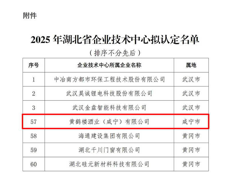 近日,湖北省發(fā)展和改革委員會(huì)發(fā)布了“2025年湖北省企業(yè)技術(shù)中心”認(rèn)定名單。黃鶴樓酒業(yè)(咸寧)有限公司憑借扎實(shí)的技術(shù)研發(fā)實(shí)力、系統(tǒng)化的創(chuàng)新體系和持續(xù)的產(chǎn)業(yè)引領(lǐng)能力成功躋身榜單。