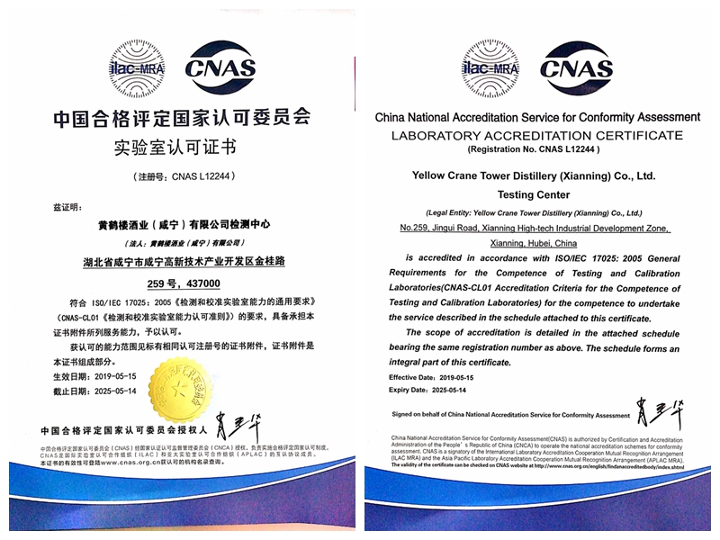 近日,黃鶴樓酒業咸寧檢測中心通過CNAS(中國合格評定國家認可委員會)認可,獲得由中國合格評定國家認可委員會(CNAS)頒發的國家實驗室認可證書。